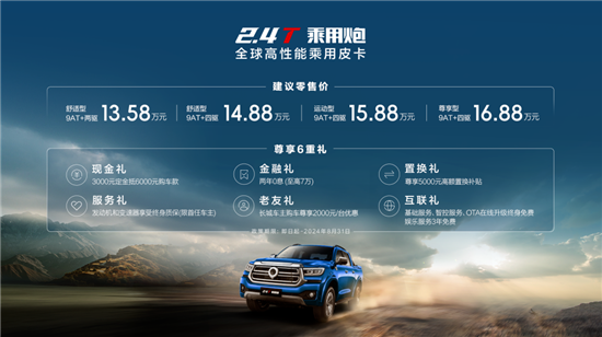 8月15日,车质网从官方获悉,长城旗下长城炮2.4T乘用炮新增车型现已正式上市,新车推出4款车型,售价区间13.58-16.88万元。