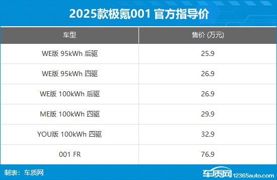 8月13日,2025款极氪001正式上市,此次共推出6款车型,售价区间为25.9-76.9万元。新车主要针对智驾系统进行升级,并新增加WE版后驱入门款车型。