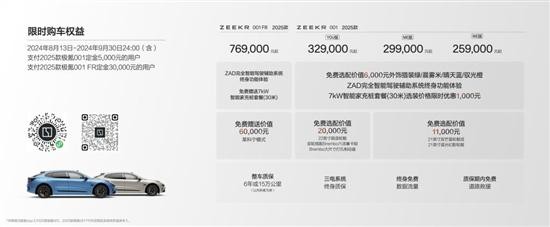 购车权益方面,9月30日24:00(含)前支付定金5,000元的用户可免费选配22/21英寸多辐条轮毂、猎装绿/晨雾米/晴天蓝/驭光橙车漆色、ZAD完全智能驾驶辅助系统终身功能体验和7kW智能家充桩套餐(30米)。新车主下定2025款极氪001可享1万元尾款抵扣。