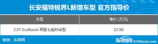 8月28日,长安福特锐界L两驱七座时尚型正式上市,新车售价为22.98万元。根据官方消息,8月31日前购买锐界L全系车型均可享受至高41888元购车礼。