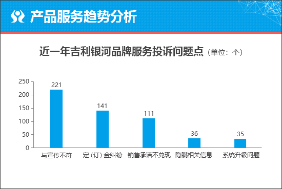 从服务投诉问题点来看,“与宣传不符”、“定(订)金纠纷”投诉量相对较高,通过进一步分析可知,该问题主要来自于吉利银河L7车型。