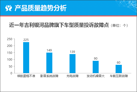 作为全新车型,吉利银河E5是否会有发生质量问题的隐患?对此,我们将从过去一年吉利银河品牌旗下车型的故障问题入手,通过故障问题比对,从而初步预测未来新车质量问题的发展趋势。