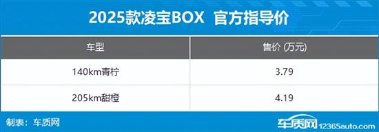 9月4日,2025款凌宝BOX正式上市,新车推出2款车型,售价3.79-4.19万元。新车的纯电续航里程分别为140km和205km。
