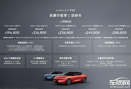 9月5日,领克旗下首款纯电动车——领克Z10在杭州正式上市,新车共推出5款车型,官方售价区间为20.28-29.98万元。在2024年10月31日(含)期间支付5000元定金下订,且在2024年12月31日(含)前完成提车的用户,还可享受19.68-28.88万元的上市限时价以及至高52000元的限时购车权益。
