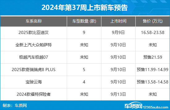 2024年第37周(9月9日-9月15日)上市新车预告: