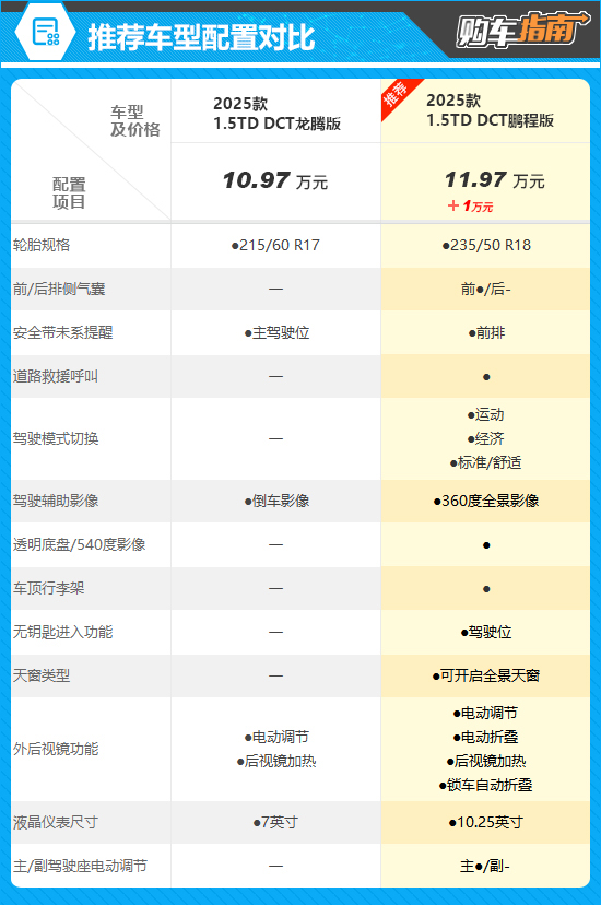 推荐车型为鹏程版,厂商指导价11.97万元。推荐车型较入门车型增加了众多安全、驾驶辅助和实用性配置,如前排侧气囊、透明底盘/540度影像、360度全景影像和可开启全景天窗等,上述配置的加入,让日常用车更方便、更安全,且购车成本却仅需增加1万元,性价比更高。