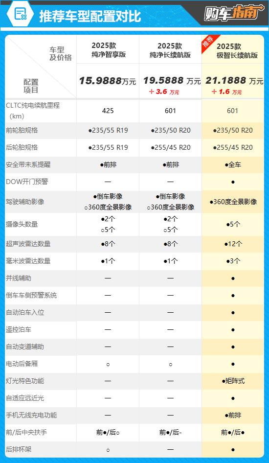 推荐车型价格在纯净长续航版的基础上增加了1.6万元,从配置上来看,除增加电动后备厢、后排中央扶手和后排杯架等实用配置外,辅助驾驶功能得到大幅提升,对于日常驾驶帮助很大,可以说是物有所值的。
