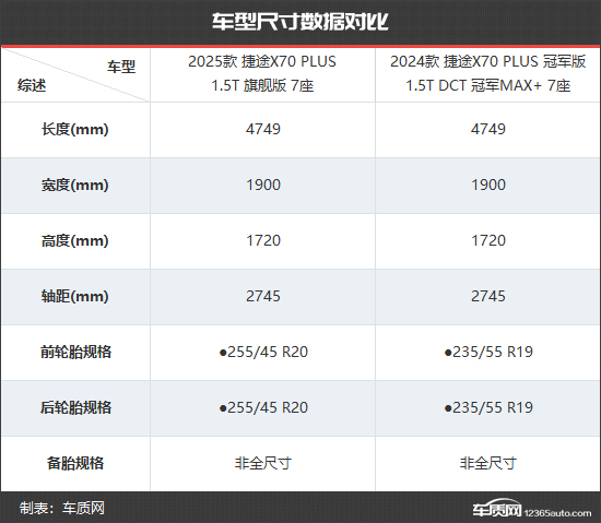 车身尺寸方面,新款捷途X70 PLUS的长宽高和轴距均没有变化,与老款车型保持一致。轮圈方面,新款捷途X70 PLUS换装了全新的双五辐铝合金轮圈,相比老款车型的样式更加干练。同时,新款车型的轮胎规格也有所变化,为255/45 R20,相比老款车型尺寸更大,宽度和扁平比也更具运动化属性。