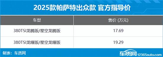 9月10日,上汽大众帕萨特380TSI家族正式上市,共推出5款车型,新车售价区间为17.69-23.99万元。其中,2025款上汽大众帕萨特出众款限时一口价15.99-17.99万元,帕萨特Pro限时一口价18.99-22.39万元。同时,上汽大众还宣布多种购车权益,例如动力总成终身质保即日起扩大至所有燃油车型、购买帕萨特380TSI家族的首任非营运车车主,可终身享受车辆动力总成质保。