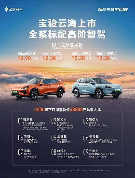 9月10日,宝骏旗下全新紧凑型SUV——宝骏云海正式上市,共推出四款配置车型,限时先享价为10.98-13.38万元。新车基于天舆架构打造,官方表示,从云海开始,后续推出的宝骏车型均会标配智驾系统。