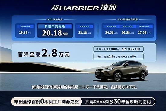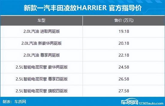 9月12日,一汽丰田新款丰田凌放HARRIER正式上市,共推出6款车型,售价19.18-27.58万元。相比老款车型,新车起售价下调2万元,并减少三款车型。