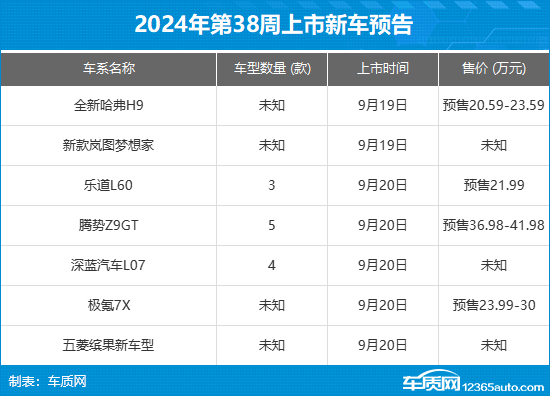 2024年第38周(9月16日-9月22日)上市新车预告