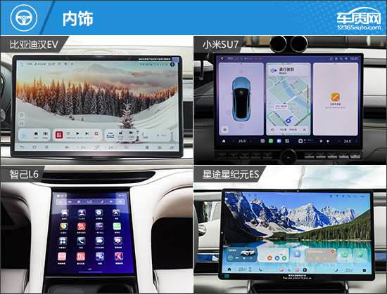 内饰方面,除比亚迪汉EV的设计更趋稳重一些外,其余三款车型的设计都更加贴合了时下主流的极简风。其中,小米SU7和星途星纪元ES的整体布局稍显常规,虽说液晶仪表、悬浮式中控大屏都有配备,但抓人眼球的地方不多。相比之下,智己L6在这方面做到了领先,像半辐式方向盘、贯穿中控台的大尺寸屏幕,看上去更加新潮。