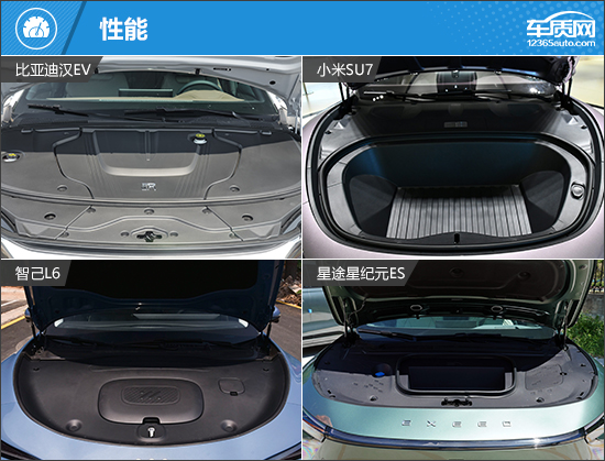 车身尺寸方面,由于四款车型均定位为中大型车,视觉上都具有庞大的体量感。不过,小米SU7和星途星纪元ES的整体表现要更优一些,分别在车长、车宽上占据优势,并且轴距也达到3000mm。比亚迪汉EV在车身高度上表现最好,头部空间更充裕。相比之下,智己L6整体表现中规中矩,各项尺寸表现都不突出。