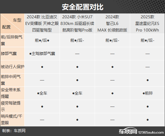 安全配置方面,比亚迪汉EV在被动安全配置方面优势明显,多出了后排侧气囊、主驾膝部气囊,安全防护更全面。主动安全配置方面,小米SU7和星途星纪元ES表现出色,均配备有哨兵模式/千里眼,实现了用户对车内外情况的实时掌握。而智己L6在安全配置层面显然是和其他三款车型有所差距,表现平平。