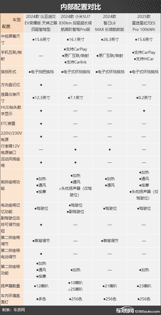 内部配置方面,比亚迪汉EV的整体表现最为出色,相比其余三款车型多出了方向盘记忆、ETC装置、220V/230V电源、副驾驶位后排可调节按钮等配置,更好地保障了用户日常用车的便利性和舒适性。相比之下,智己L6的表现中规中矩,座椅功能性表现不佳。