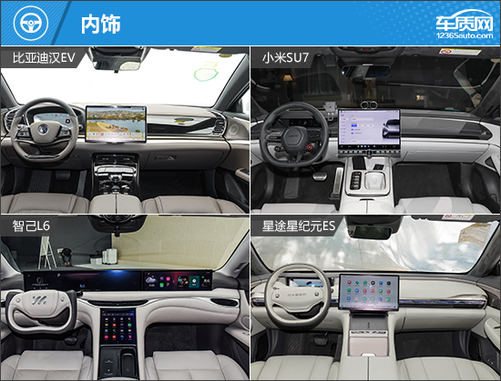内饰方面,除比亚迪汉EV的设计更趋稳重一些外,其余三款车型的设计都更加贴合了时下主流的极简风。其中,小米SU7和星途星纪元ES的整体布局稍显常规,虽说液晶仪表、悬浮式中控大屏都有配备,但抓人眼球的地方不多。相比之下,智己L6在这方面做到了领先,像半辐式方向盘、贯穿中控台的大尺寸屏幕,看上去更加新潮。