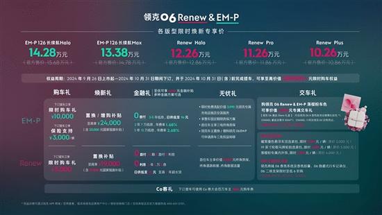 近日,焕新而来的领克06家族正式上市,新车提供燃油、插电混动两种动力选择。其中燃油Renew版车型限时专享价为10.26-12.26万元;插混EM-P车型限时专享价为13.38-14.28万元。