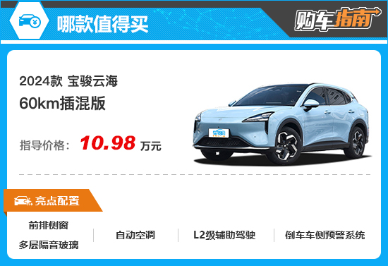 2024款宝骏云海入门车型为60km插混版,售价10.98万元。抛开当下主流的插电式混合动力系统外,其在配置方面的表现也十分亮眼,可谓是真正做到了入门即高配。事实上,由于宝骏云海推出的这4款车型,在配置方面基本都处于同一水平,因此入门版车型就非常值得推荐,性价比颇高。