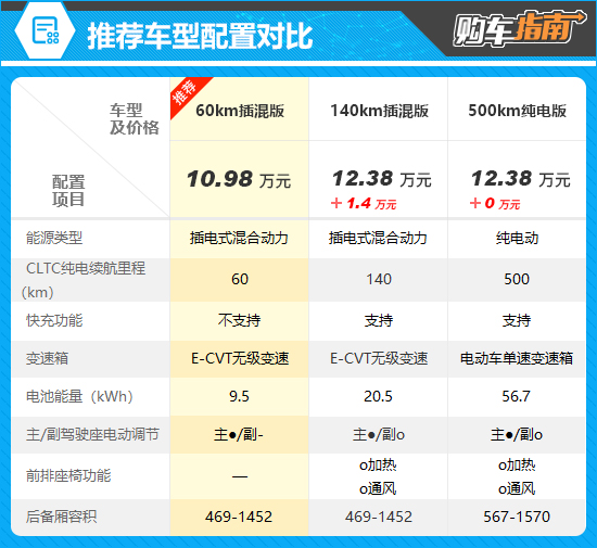 推荐车型为入门的60km插混版,售价10.98万元。再高一个配置的车型为140km插混版,售价12.38万元。其除了纯电续航里程和快充功能外,其余配置相比推荐车型并无太多诚意,包括副驾驶座电动调节、前排座椅加热及通风功能,都只是提供了选装机会而已。结合1.4万元的差价来看,个人感觉这个升级并不值得。毕竟,入门版车型的CLTC纯电续航里程也达到了60km,基本能够满足城市内的短途代步需求。