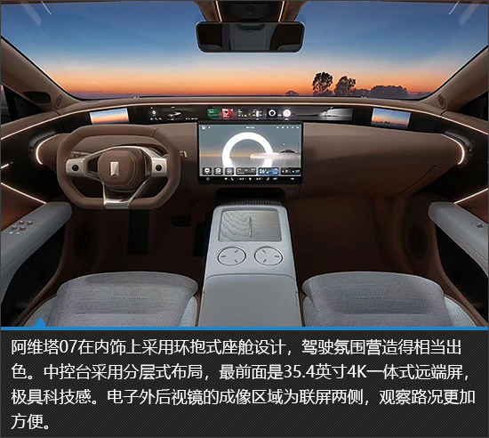 内饰方面,阿维塔07以简约化为主,环抱式座舱可带来更强的驾驶氛围,35.4英寸4K一体式远端屏的加入也使车内更具科技感。新车内饰采用多种软性材质进行包裹,进一步提升了内饰的豪华感。