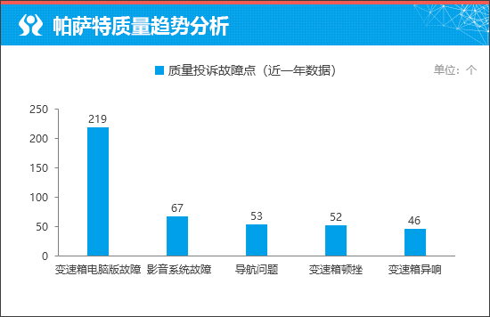 通过筛选帕萨特车型近一年的投诉数据可以发现,主要故障问题为“变速箱电脑板故障”,进一步分析得知,由于帕萨特Pro并未对变速箱进行升级,而是采用了与老款车型相同的变速箱,所以暂且认为其存在出现上述问题的几率,具体情况如何,还要待其使用一段时间后才能有定论。