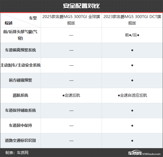 安全配置方面,新款MG5相比老款车型有所缩水,少了前/后排头部气囊、车道偏离预警系统、主动刹车/主动安全系统、前方碰撞预警等。同时,在驾驶功能方面,新款MG5也有所简配,相比老款车型少了车道保持辅助系统、车道居中保持、道路交通标识识别等。