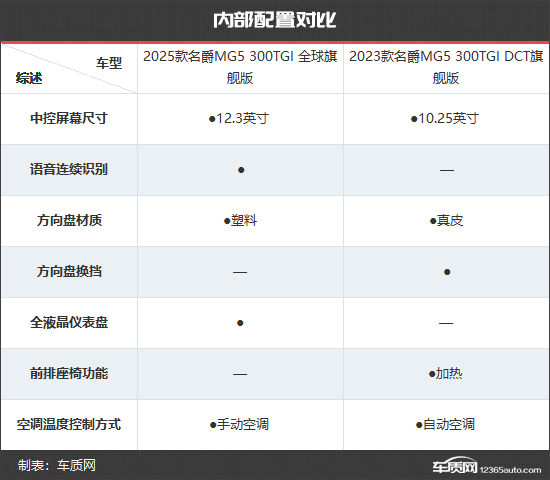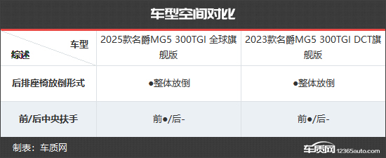 2025款上汽名爵MG5共推出3款车型,相较老款而言,顶配车型厂商指导价有所下调,入门车型的厂商指导价则有明显上涨,这是因为取消手动挡车型所致。需要说明的是,因为官方推出了“惊爆一口价”(即日起至2024年11月30日),2025款上汽名爵MG5实际售价并不高于老款车型。为了直观对比,我们选取2025款上汽名爵MG5 300TGI 全球旗舰版和2023款上汽名爵MG5 300TGI DCT旗舰版进行比较,以便更加直观地看出新老款车型在配置层面的具体变化。