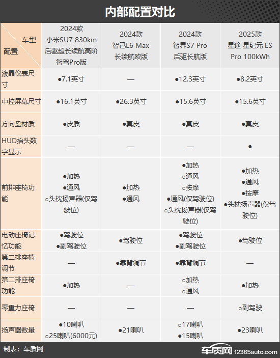 内部配置方面,星纪元 ES保持领先,独享前排座椅按摩、头枕扬声器(仅驾驶位)、HUD抬头显示功能,非常厚道;此外,其还可以选装副驾驶零重力座椅,舒适性有所升级。相比之下,智己L6表现则有些不尽如人意,舒适性配置略有欠缺。