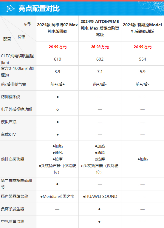 具体到车辆配置层面,我们挑选了售价尽可能相近的车型。通过对比来看,阿维塔07不仅CLTC纯电续航里程最长,而且百公里加速最快。在配置层面,阿维塔07也独享后排侧气囊、防侧翻系统、模拟声浪、车载KTV、第二排座椅电动调节,用车体验更加出色。值得一提的是,阿维塔07还支持电子外后视镜功能的选装,给予消费者浓郁的科技感。此外,AITO问界M5的表现也可圈可点,拥有HUAWEI SOUND音响,并且独享负离子发生器和空气质量监测功能。相比之下,特斯拉Model Y由于售价偏低,整体表现不如上述两款车型,配置缺失较多。