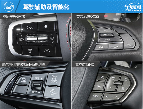 内饰方面,四款车型都采用常规样式的中控台造型。其中,英菲尼迪QX55和斯坦维的中控屏幕采用内嵌式设计,雷克萨斯NX为悬浮式屏幕,捷尼赛思GV70则是采用27英寸全液晶仪表盘+中控多媒体显示屏的双联屏。四款车型均采用家族最新样式的方向盘且同为三辐式设计,造型时尚精致,符合自身的定位。