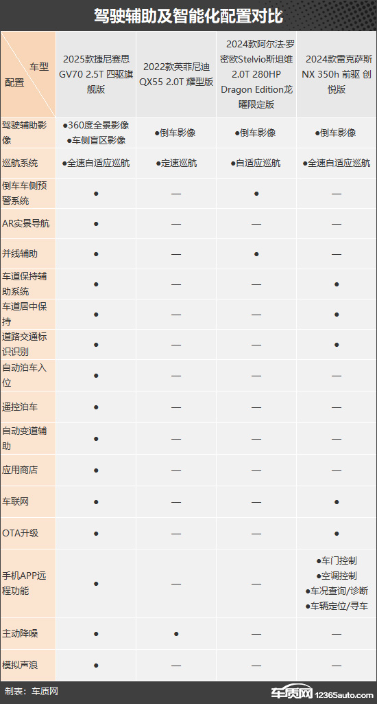 本次挑选的四款车型分别为2025款捷尼赛思GV70(以下称:捷尼赛思GV70)、2022款英菲尼迪QX55(以下称:英菲尼迪QX55)、2024款阿尔法·罗密欧Stelvio斯坦维(以下称:斯坦维)和2024款雷克萨斯NX(以下称:雷克萨斯NX)。四款车型均定位豪华中型SUV,价格均低于40万元。(由于目前图片数量较少,因此部分车型的图片并不是相对应的具体款型)