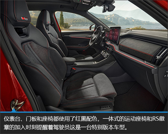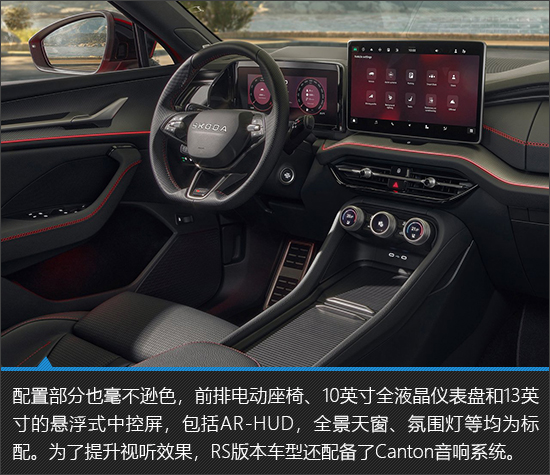纯黑色的内饰搭配红色缝线让座舱内部的运动感直线上升,座椅采用了一体式设计并带有红色缝线。RS徽章的加入时刻提醒着驾驶员这是一台特别版本车型。内饰用料上,座椅均采用了打孔皮质,仪表台和车门等位置都使用了黑色麂皮覆盖,非常有质感。配置部分也毫不逊色,前排电动座椅、10英寸全液晶仪表盘和13英寸的悬浮式中控屏、包括AR-HUD,全景天窗、氛围灯等均为标配。