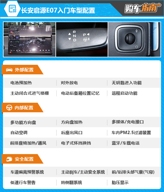 长安启源E07的入门级车型是厂商指导价19.99万元的纯电70kWh Air智能版。虽然是入门级车型,但整体表现并不算差,像无钥匙进入功能、电动后备厢、方向盘加热、前排座椅加热/通风、自动空调、前排手机无线充电等便利性和舒适性配置均有所配备。之所以没有推荐入门级车型,主要原因在于还有性价比更高、性能表现更好的车型。