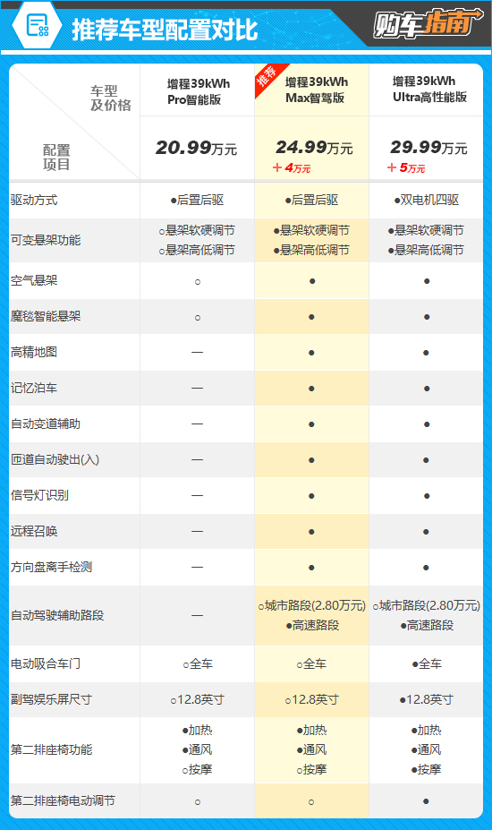 从配置对比来看,两款推荐车型相比低一级别车型在驾驶功能方面有明显提升,如多出高精地图、记忆泊车、自动变道辅助、匝道自动驶出(入)、远程召唤等,同时,低一级别车型需要加价选装的可变悬架功能、空气悬架、魔毯智能悬架也变为标配。用车体验更好且车辆动态性能提升,售价却仅增加4万元,可谓性价比颇高。高一级别车型较推荐车型主要是将一些选装的外观/防盗和舒适性配置从选装变成标配,如第二排座椅电动调节、12.8英寸副驾娱乐屏、电动吸合车门等;同时,其还从推荐车型的后置单电机变成了前后双电机。虽然配置和性能有提升,但因为购车预算还要再增加5万元,性价比不高。