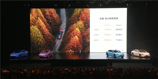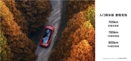 另外,智界新S7还提供100度电池版,其中后驱为855公里,四驱版为785公里,全面超越特斯拉Model 3。