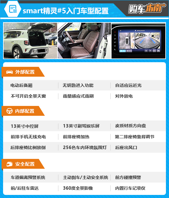 现如今新能源市场内卷激烈,想要得到消费者认可,就必须拿出十足的诚意。从smart精灵#5入门车型来看,标准配置的表现能够令人满意。像电动后备厢、无钥匙进入功能、雨量感应式雨刷、前排座椅加热、手机无线充电、前/后驻车雷达以及360度全景影像等使用频率较高的配置均有所配备,同时还提供了年轻消费者喜闻乐见的256色车内环境氛围灯,因此入门车型也是本次最为推荐的车型。