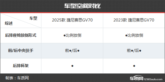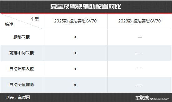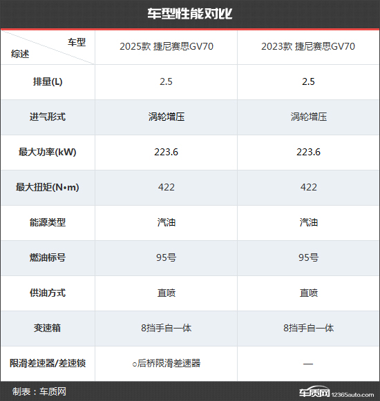 2025款捷尼赛思GV70与老款车型相比,起售价和最高售价均有所降低,不过动力系统没有变化,依旧搭载2.5T发动机+8速手自一体变速箱的组合。为了直观看出新老款车型的变化,本文选取新老款车型的顶配车型进行对比。