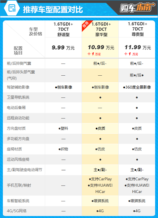 1.6TGDI+7DCT尊贵型虽然比推荐车型增加了360度全景影像、电动后备厢等配置,但大多都是属于锦上添花的类型,为此再多花10000元并不划算,性价比不高。