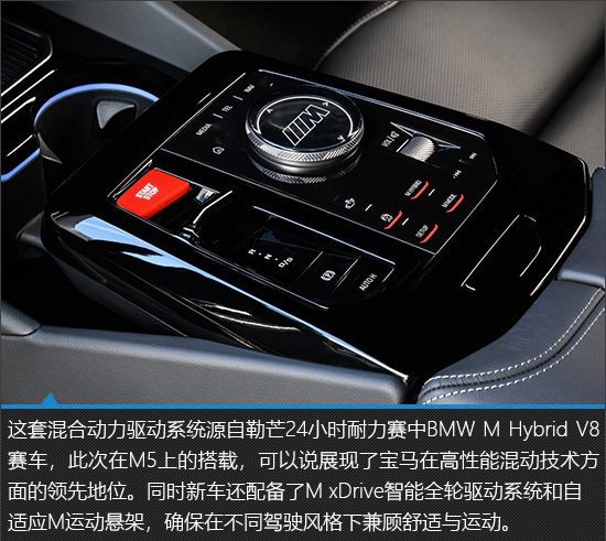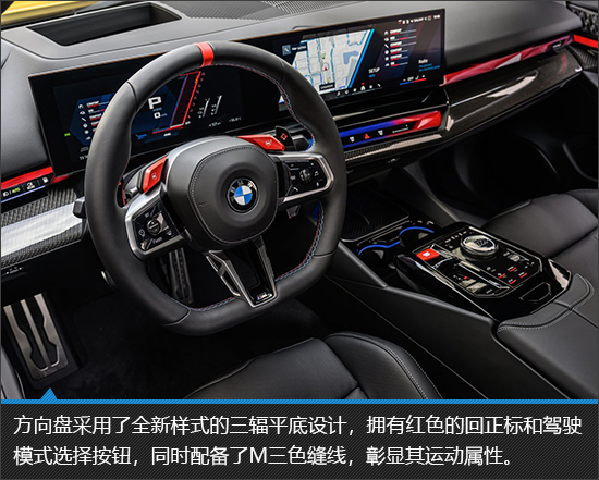 宝马M5的内饰布局以驾驶者为核心,整体设计风格简约而不失豪华。全黑的配色搭配少量的红色按键点缀,让内饰拥有极佳的运动氛围。中控台采用了大量的软质材料包裹,并辅以精致的缝线工艺,营造出高品质的触感。同时,内饰中的碳纤维饰条和金属装饰件,进一步提升了车内的运动感。