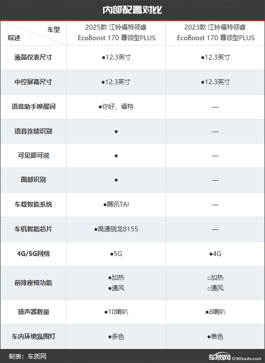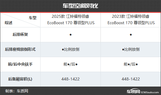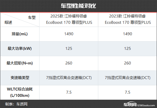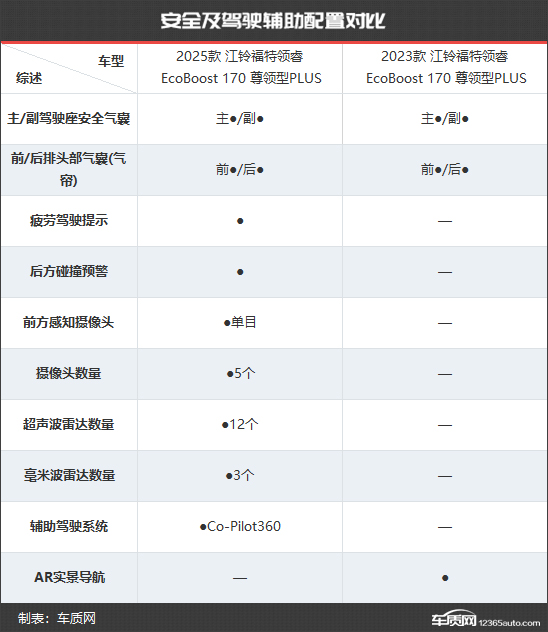 2025款江铃福特领睿共推出5款车型,相比2023款江铃福特领睿少了3款车型。售价方面,新款车型的起售价与老款车型相同,顶配售价减少了4300元。为了更直观地看出新老款车型在配置层面的具体差异,我们选择了两款售价相同的车型进行对比,两者售价均为16.55万元。