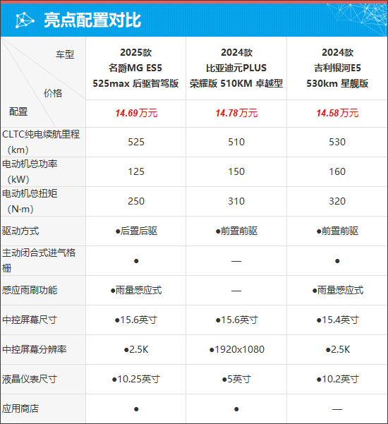 具体到车辆配置层面,我们挑选了售价尽可能相近的车型。动力部分,虽然名爵MG ES5的电动机参数略显保守,但是满足日常使用并无任何压力,其亮点主要是采用了后置后驱的布局。其他配置部分,客观来说三款车型的整体差异并不大,并没有哪款车型能够占据明显上风,竞争激烈程度可见一斑。