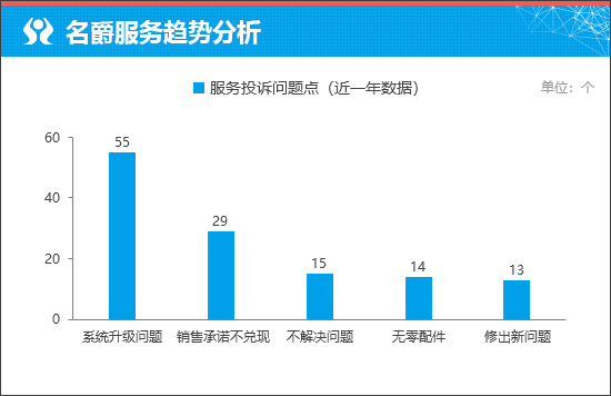 从服务投诉问题点来看,“系统升级问题”成为车主对于名爵品牌抱怨相对较多的服务问题。通过进一步分析可知,投诉问题主要来自名爵MG ONE车型。