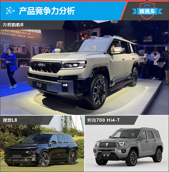 在国内新能源中大型SUV市场中,方程豹豹8还是要面对不少的竞争对手。其中,理想L8和坦克700 Hi4-T(以下简称:坦克700)便是其中的佼佼者,前者更是凭借“奶爸神车”的属性在新能源中大型SUV领域中站稳脚跟。此次我们就以上述两款车型列为竞争对手,看看方程豹豹8如何应对。