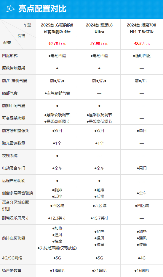 具体到车辆配置层面,我们挑选了售价尽可能相近的车型。配置方面,方程豹豹8的综合表现取得领先,独享主驾膝部气囊、夜视系统、头枕扬声器(仅驾驶位)等,在安全性、驾驶功能等方面表现优秀。理想L8紧随其后,配备六区域语音唤醒识别、15.7英寸副驾娱乐屏和21喇叭等。相比之下,参与对比的坦克700车型虽然售价最高,但在配置方面表现却不尽如人意。