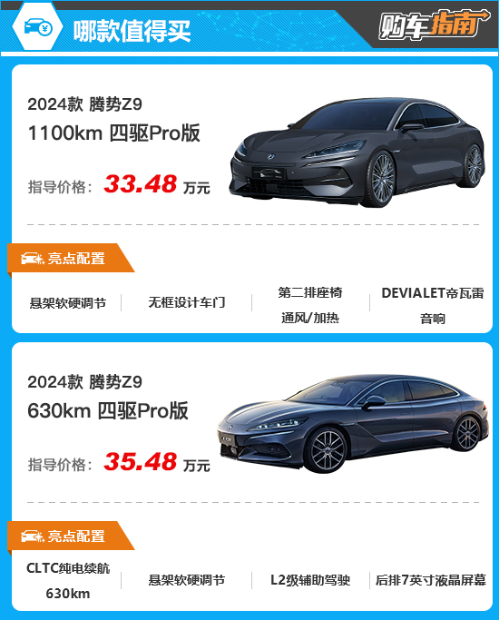 腾势Z9入门版车型为四驱Pro版,插混版和纯电版各有一款,售价分别为33.48万元以及35.48万元。客观来说,作为一款高端定位的中大型车,腾势Z9基本达到了人们对于“入门即高配”的心理预期,甚至就连很多进阶配置也同样全系标配,涉及舒适性、安全性以及科技配置,表现得十分全面,诚意十足。鉴于其出色的性价比表现,因此两款入门版车型就已经非常值得推荐。