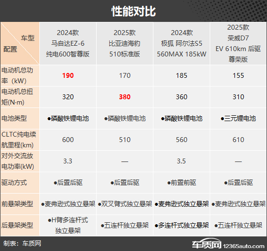 客观来说,对于科技性和舒适性配置这两个方面,四款车型均展现出了比较强劲的竞争力,满足日常使用并无压力。对比之下,整体表现最为突出的是马自达EZ-6,这个结果着实有些令人意外。在售价相差不大的前提下,其在配置层面居然能够打败以性价比见长的自主品牌车型,实属不易。不出意外,综合竞争力表现最差的依然还是荣威D7,倒也谈不上多么寒酸,只是对比竞品确实没有优势可言。