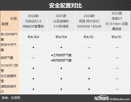 客观来说,四款车型的基础配置都比较丰富,能够满足日常使用,差异主要体现在进阶配置部分。比较遗憾的是,荣威D7继轴距被竞品“完爆”之后,在外观配置环节也被迫沦为了背景板,唯一的亮点只剩下全景天窗支持开启。马自达EZ-6和极狐阿尔法S5均配备无框设计车门、电动后备厢以及全车无钥匙进入功能,不同点在于,极狐阿尔法S5的电动扰流板需要通过选装才能得到。比亚迪海豹独享矩阵式大灯以及前/后排侧窗多层隔音玻璃,实用性表现出色。