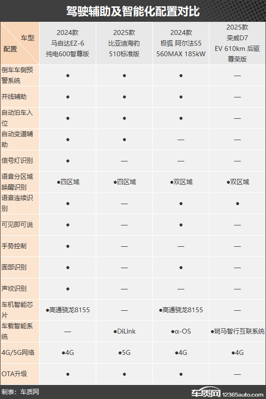 驾驶辅助硬件配置方面,四款车型的整体表现都比较出色,基本达到了同级别平均水平。智能化配置部分,对比配置表来看,荣威D7仍然有些掉队,而整体表现最好的还是马自达ZE-6。当然,这些配置对于日常使用的影响并不大,大多都属于是加分项。
