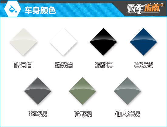 车身颜色方面,新车提供了7种配色可选。其中,低饱和色的旷野绿比较时尚,高级感也更强,可优先考虑。此外,珠光白配色需要选装才可以获得,价格为2000元。